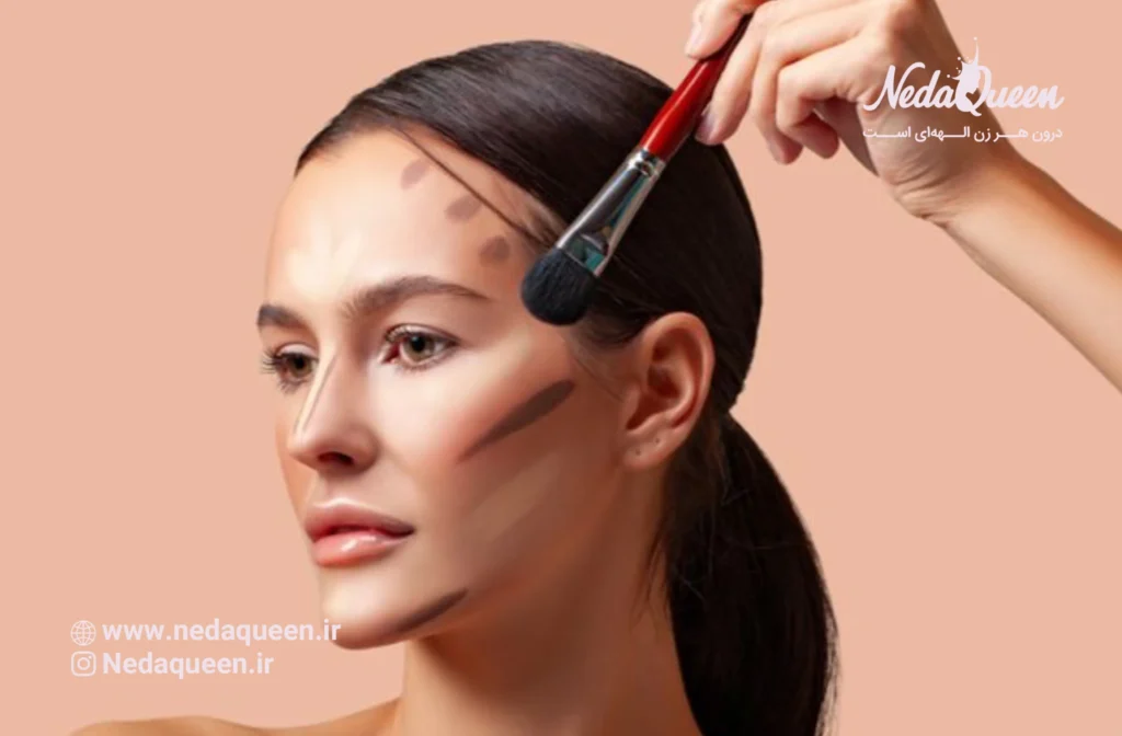 اجرا:تیرهسازی دقیق روی گوشههای خط فک (درست زیر گوش) و همچنین گوشههای پیشانی (شقیقهها) برای گردتر و باریکتر نشان دادن صورت. از هایلایت کردن مرکز چانه و پیشانی خودداری کنید.